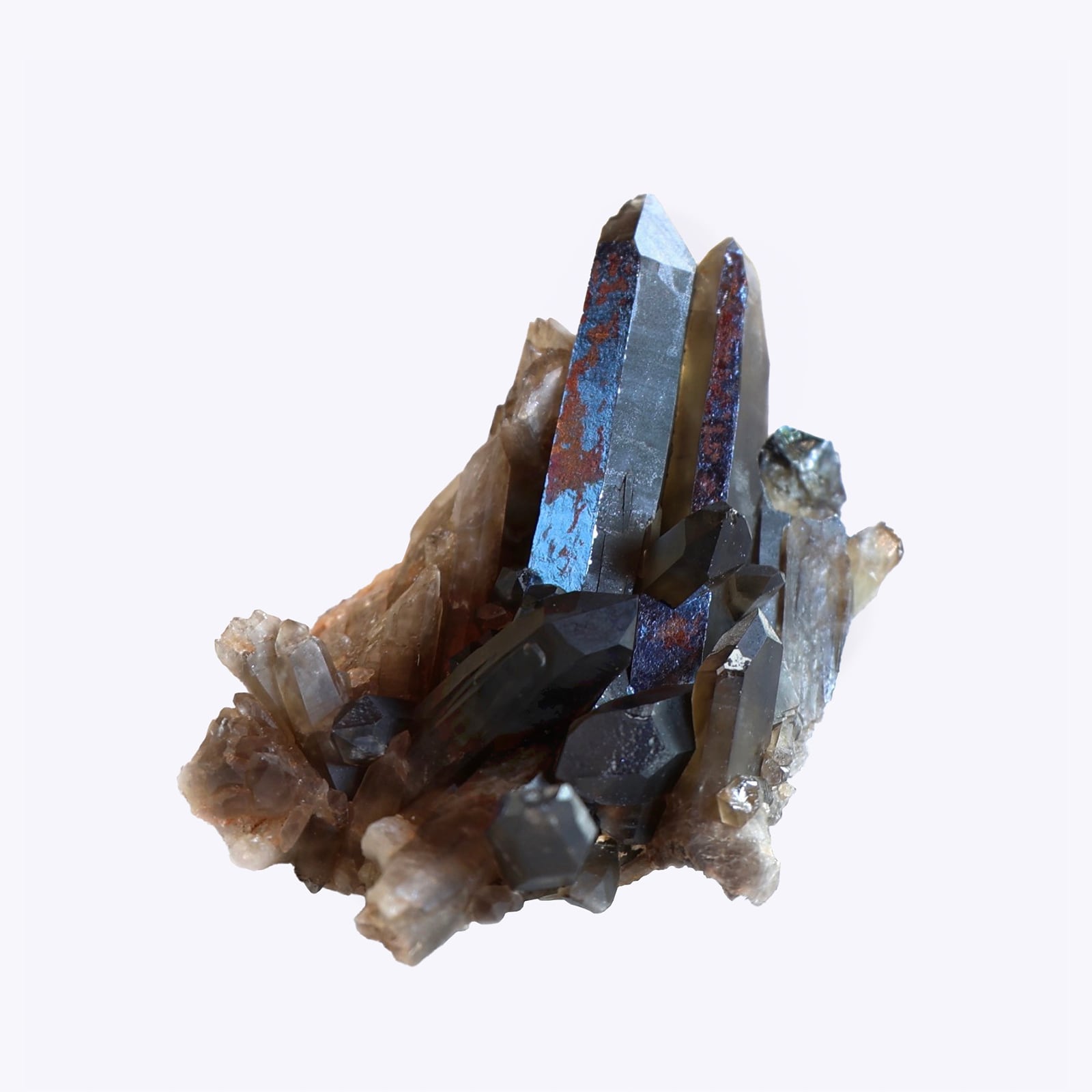 スモーキークォーツをベースに、結晶面の方向に合わせて、手作業で濃サックスと赤貝色の光陽箔を貼り付けています。光の当たり方や角度によって、さまざまな色合いへと変化する美しい視覚効果が生まれます。